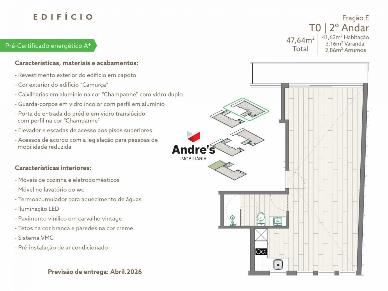 T0 NOVO | Varanda 3,16m2 | Prontos em Abril 2026 | Bonfim | Porto ** Previsão de entrega: Abril de 2026 ** Características, materiais e acabamentos: - Duas frentes solares (Nascente/Poente) - Arrumo privativo de 2,86m2 - Revestimento exterior do edifício em capoto - Cor exterior do edifício "Camurça" - Caixilharias em alumínio na cor "Champanhe" com vidro duplo - Guarda-corpos em vidro incolor com perfil em alumínio - Porta de entrada do prédio em vidro translúcido com perfil na cor "Champanhe" - Elevador e escadas de acesso aos pisos superiores - Acessos de acordo com a legislação para pessoas de mobilidade reduzida Características interiores: - Móveis de cozinha e eletrodomésticos - Móvel no lavatório do wc - Termoacumulador para aquecimento de águas - Iluminação LED - Pavimento vinílico em carvalho vintage - Tetos na cor branca e paredes na cor creme - Sistema VMC - Pré-instalação de ar condicionado Andre's Imobiliária - desde 2013 a crescer com o Porto