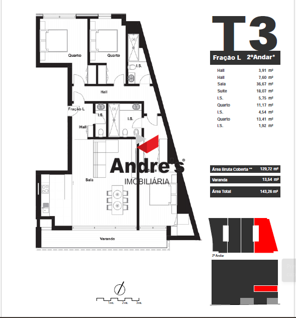 T3 NOVO | 2 lugar de garagem | Varanda 14m² | Leça da Palmeira O apartamento T3 apresenta uma área generosa de 130m² e uma distribuição eficiente dos espaços, com uma varanda de 14m² com vistas sobre o porto de Leixões, que convida a desfrutar de momentos ao ar livre com total conforto e privacidade. Os interiores foram desenhados com atenção ao detalhe, privilegiando a luz natural, a funcionalidade e o bem-estar, através da utilização de materiais de alta qualidade e de um design moderno e harmonioso. Cada fração inclui lugar de garagem, sendo que algumas contam ainda com box privada, reforçando a comodidade e segurança. Situado numa das zonas mais privilegiadas do Norte de Portugal, este empreendimento destaca-se pela localização excecional, pela arquitetura contemporânea e pela qualidade dos acabamentos. O Edifício Santiago ergue-se no coração de Leça da Palmeira, combinando a proximidade ao mar com a tranquilidade dos espaços verdes envolventes. A poucos minutos do Porto, do Aeroporto Internacional e das praias atlânticas, este projeto oferece uma experiência de vida equilibrada entre a energia citadina e o sossego residencial. O Edifício Santiago oferece soluções versáteis para diferentes estilos de vida, ideais tanto para famílias como para jovens profissionais ou investidores. As áreas brutas privativas variam entre 80 m² e 129 m², com varandas, terraços e espaços exteriores que podem ultrapassar os 80 m² nas coberturas. A localização é um dos grandes trunfos deste projeto: a apenas 2 minutos a pé de restaurantes, bares e da Quinta da Conceição, 5 minutos de bicicleta das praias de Leça da Palmeira, 10 minutos de carro do Aeroporto Francisco Sá Carneiro e 15 minutos do centro do Porto. A envolvente dispõe ainda de escolas, centros de saúde, comércio e serviços, garantindo todas as condições para uma vida cómoda e tranquila. O Edifício Santiago é uma oportunidade única para viver ou investir numa das zonas mais valorizadas da Área Metropolitana do Porto, onde o mar, a cidade e o conforto se encontram em perfeita sintonia. FRAÇÃO: L (2º PISO) Andre's Imobiliária - desde 2013 a crescer com o Porto